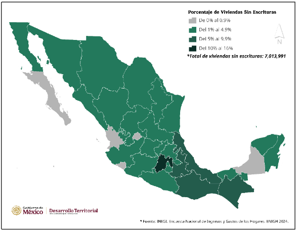 Mapa 1. Viviendas propias sin escrituras por Entidad Federativa, 2024. Fuente: Encuesta Nacional de Ingresos y Gastos de los Hogares (ENIGH) 2024, INEGI.