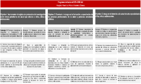 | Eje General 2. Desarrollo con bienestar y humanismo | Objetivo 2. Incrementar la capacidad resolutiva y calidad de la atención médica del Sistema Nacional de Salud. Objetivo 5. Fortalecer la integración y modernización del Sistema Nacional de Salud. | Objetivo General: Establecer un sistema de gestión hospitalaria horizontal, basado en procesos estandarizados y procedimientos específicos para cada área sustantiva del instituto, cuyos objetivos son garantizar: a) la atención, seguridad y satisfacción de los usuarios, b) el bienestar, seguridad y desarrollo del personal, c) la productividad institucional, y d) la sustentabilidad social, administrativa y financiera del instituto | Objetivo 1. Incrementar el registro de protocolos de investigación sobre temas prioritarios de salud que afectan a niños, niñas y adolescentes. | Estrategia 1.1 Promover mecanismos de integración e incorporación de investigadores e investigadoras a SII y SNII para fortalecer la investigación institucional. | 1.1.1 Promover mecanismos de integración e incorporación de personas profesionales de la salud al SII para atender problemas de salud emergentes de niñas, niños y adolescentes. 1.1.2 Apoyar la incorporación de personas profesionales de la salud al SNII para atender problemas de salud emergentes de niñas, niños y adolescentes. 1.1.3 Promover las actividades de investigación que fomenten productividad y fortalecer la vigencia de las personas investigadoras en el SII y el SNII. | 1.1 Porcentaje del presupuesto federal institucional destinado a investigación científica y desarrollo tecnológico para la salud |