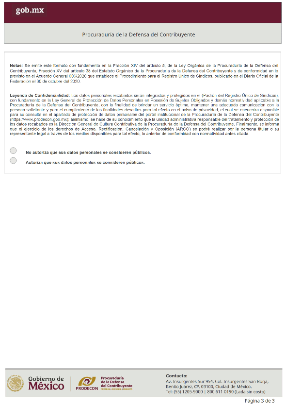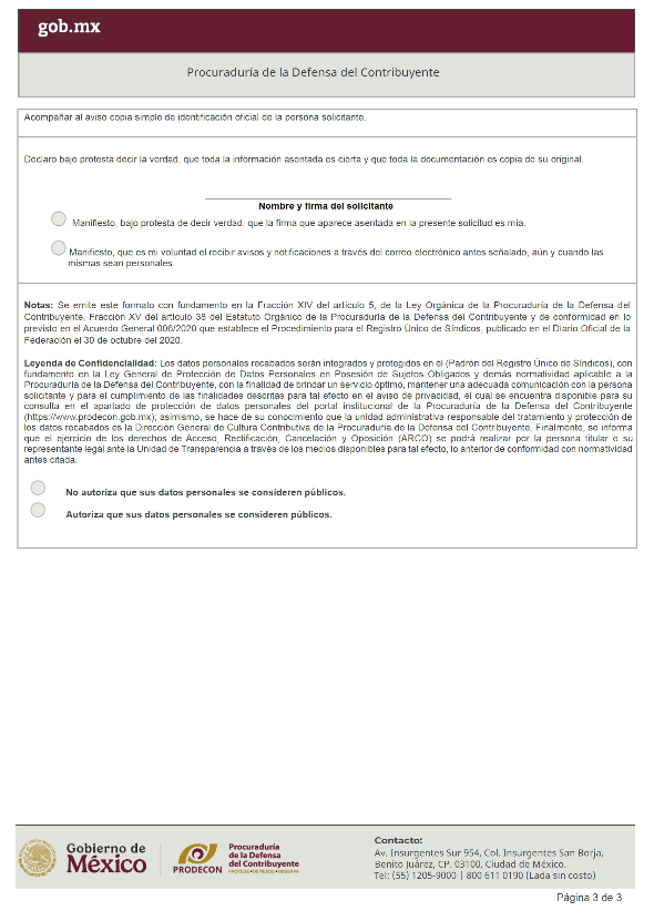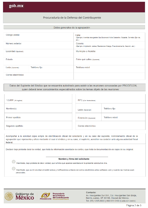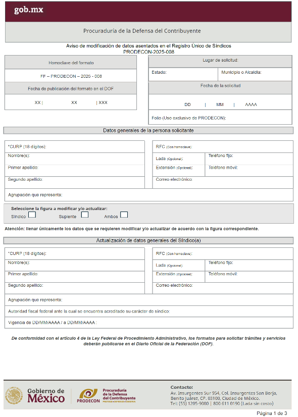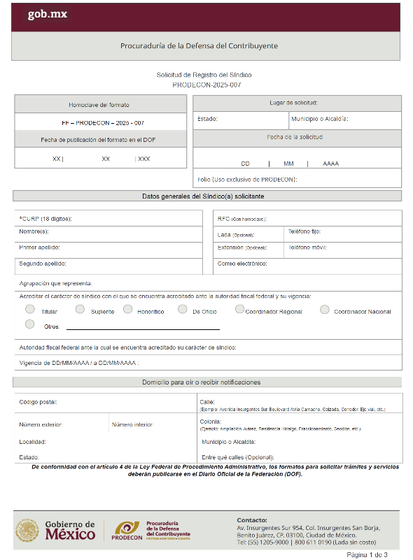 | 7 | PRODECON-2025-007 | Solicitud de Registro de Síndico. | 1. Formato de solicitud FF - PRODECON-2025-007 2. Identificación oficial vigente del solicitante y del suplente. 3. Nombramiento de la agrupación que representa. 4. Oficio mediante el cual el síndico y, en su caso, el suplente, acrediten su carácter ante alguna autoridad fiscal federal. |