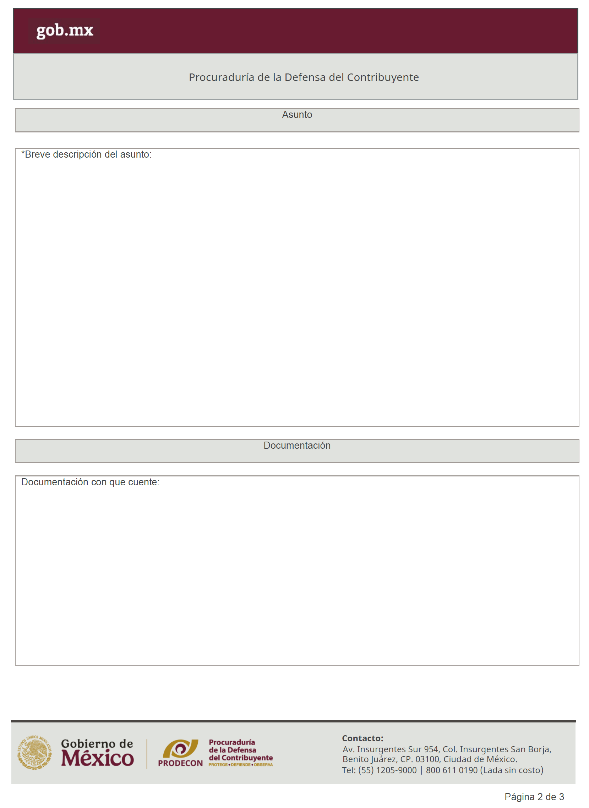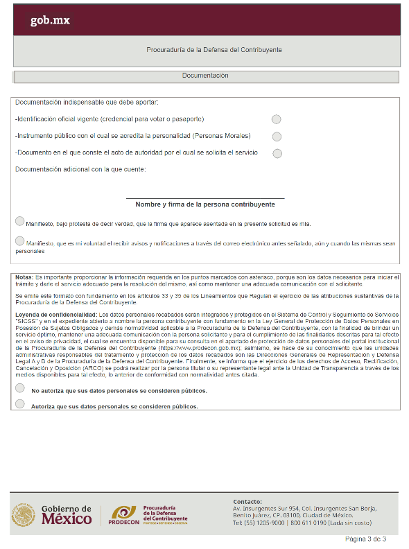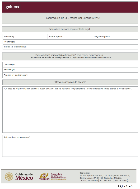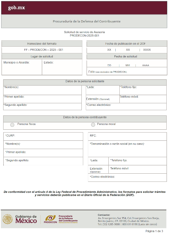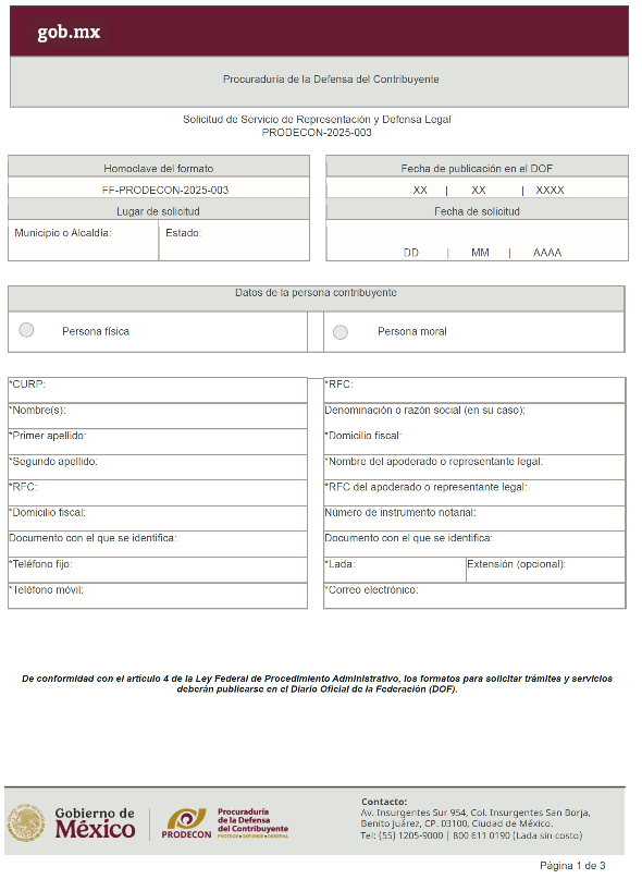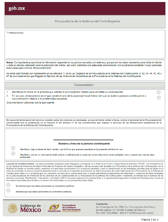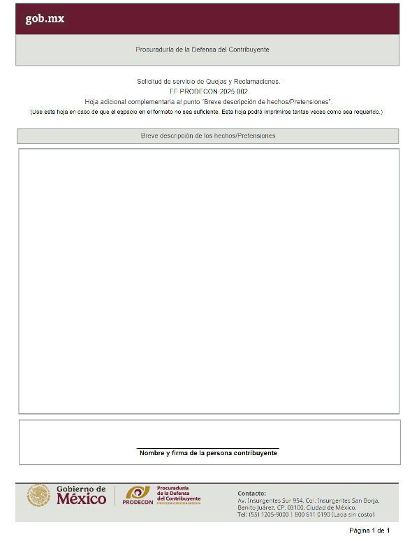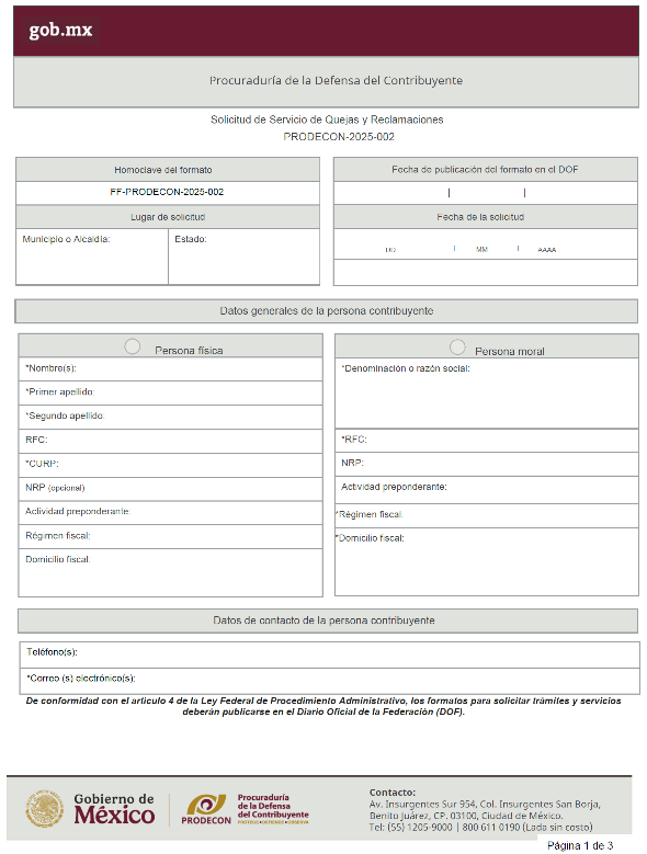 | 2 | PRODECON-2025-002 | Solicitud de Servicio de Quejas y Reclamaciones. | 1. Formato de solicitud FF - PRODECON-2025-002 2. Identificación oficial de la persona interesada, en caso de ser apoderada o representante legal presentar instrumento notarial o acta constitutiva. 3. En su caso, el documento en el que conste el acto de la autoridad fiscal federal del que se duele la persona contribuyente o documentación relativa a la problemática expuesta. |