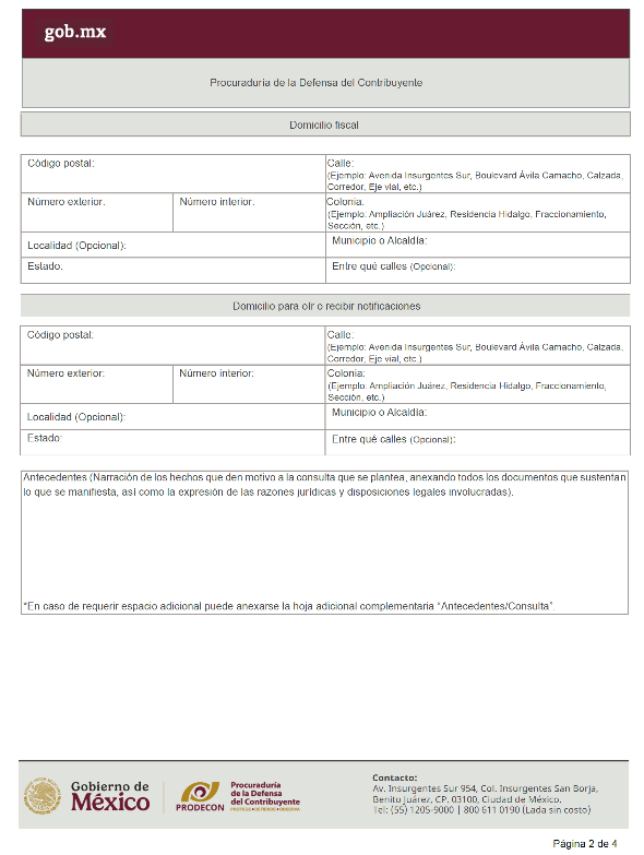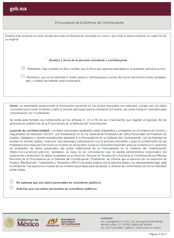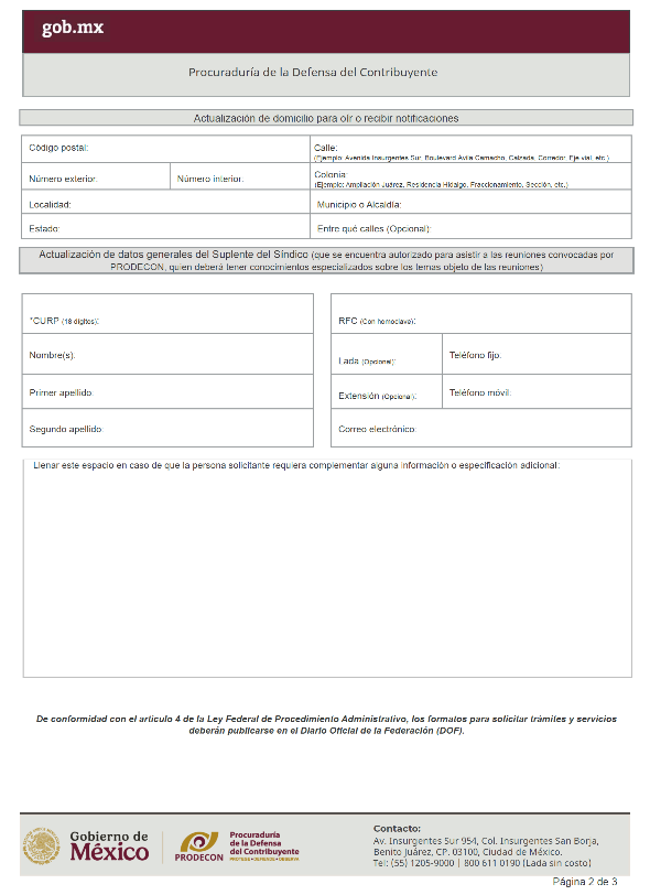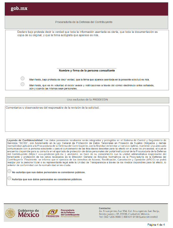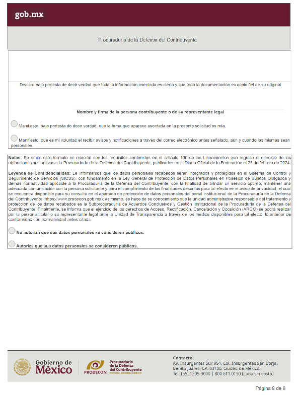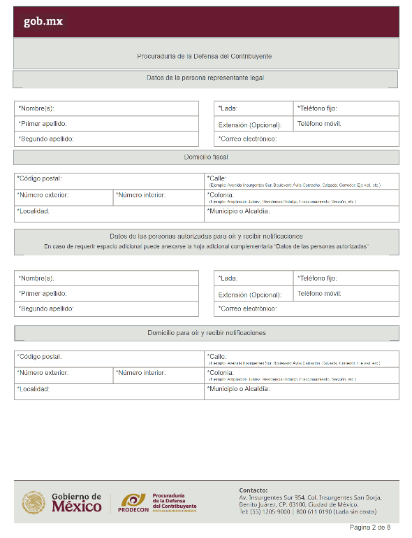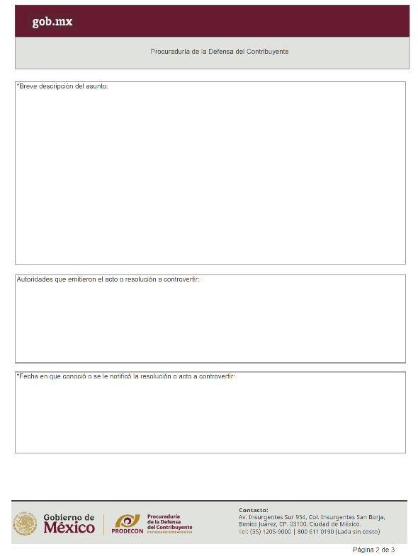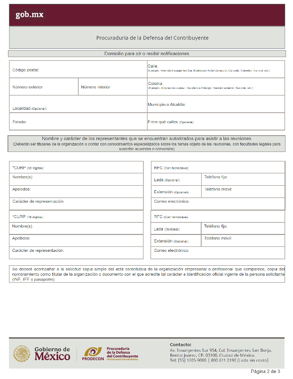 | 2 | PRODECON-2025-002 | Solicitud de Servicio de Quejas y Reclamaciones. | 1. Formato de solicitud FF - PRODECON-2025-002 2. Identificación oficial de la persona interesada, en caso de ser apoderada o representante legal presentar instrumento notarial o acta constitutiva. 3. En su caso, el documento en el que conste el acto de la autoridad fiscal federal del que se duele la persona contribuyente o documentación relativa a la problemática expuesta. |