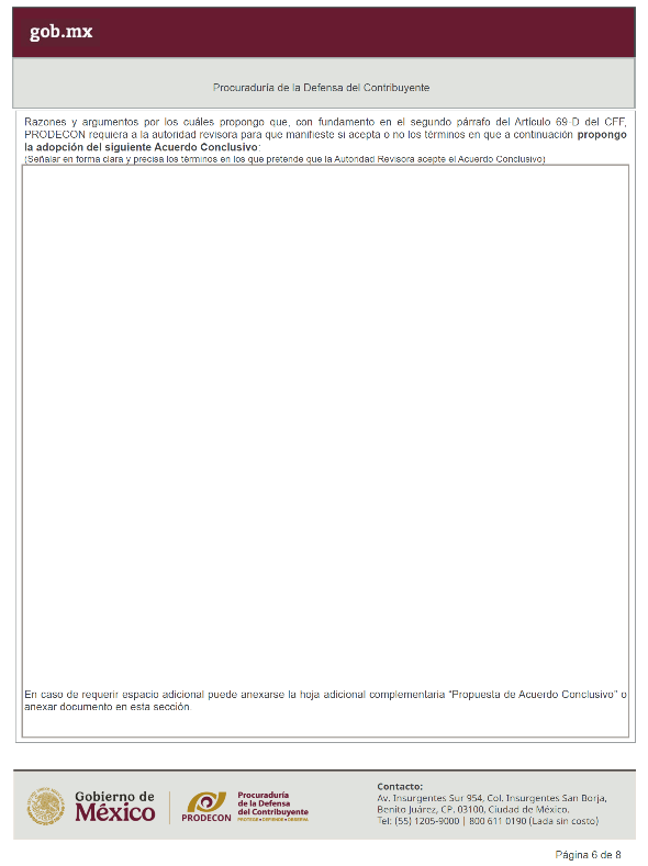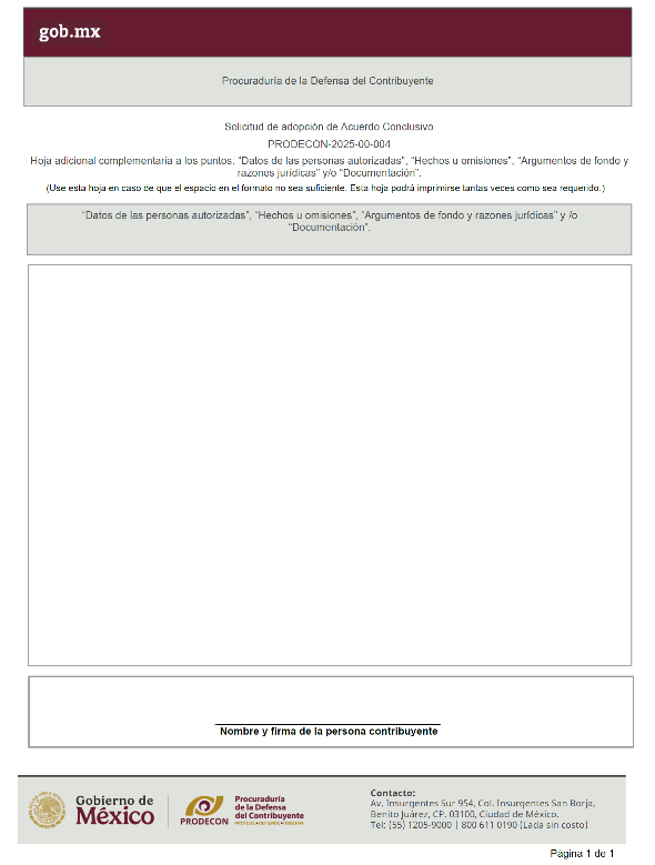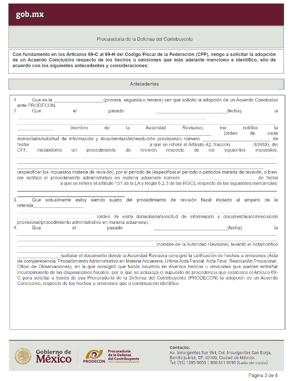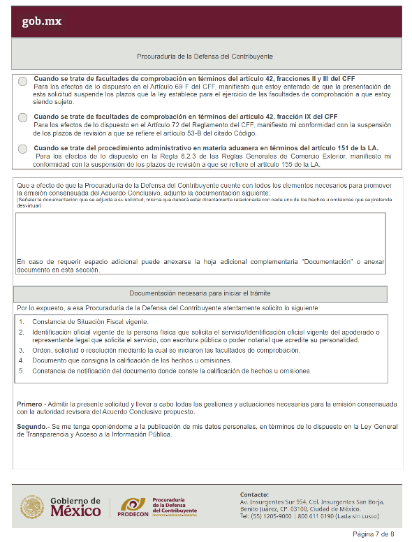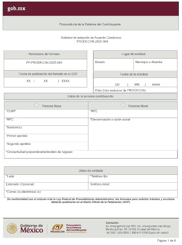 | 4 | PRODECON-2025-004 | Solicitud de adopción de Acuerdo Conclusivo. | 1. Formato de solicitud FF - PRODECON-2025-004 2. Constancia de situación fiscal vigente. 3. Identificación oficial vigente de la persona física que solicita el servicio/Identificación oficial vigente del apoderado o representante legal que solicita el servicio, con escritura pública o poder notarial que acredite su personalidad. 4. Orden, solicitud o resolución mediante la cual se iniciaron las facultades de comprobación. 5. Documento que consigna la calificación de los hechos u omisiones. 6.Constancia de notificación del documento donde conste la calificación de hechos u omisiones. |