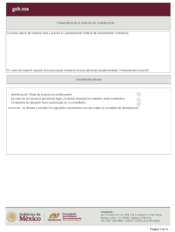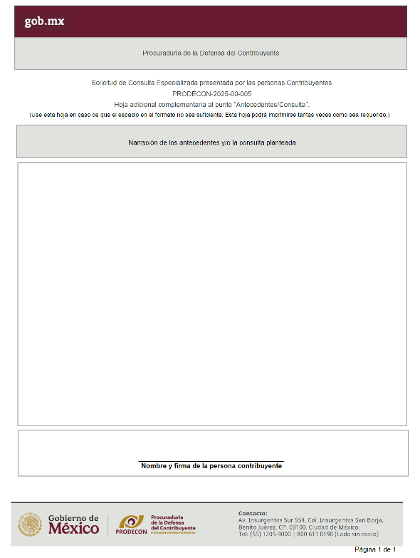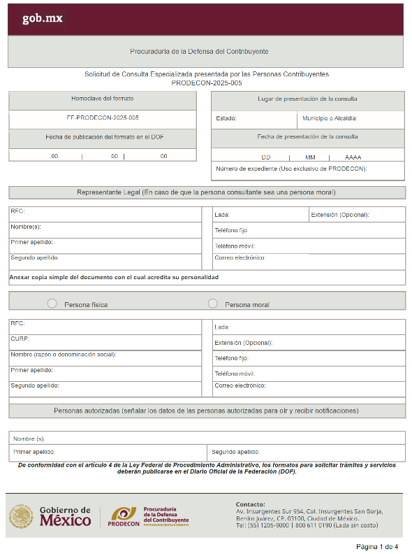 | 5 | PRODECON-2025-005 | Solicitud de Consulta Especializada presentada por las personas contribuyentes. | 1. Formato de solicitud FF - PRODECON-2025-005 2. Identificación oficial de la persona contribuyente, en caso de ser apoderada legal presentar instrumento notarial o acta constitutiva. 3. Constancia de situación fiscal. |