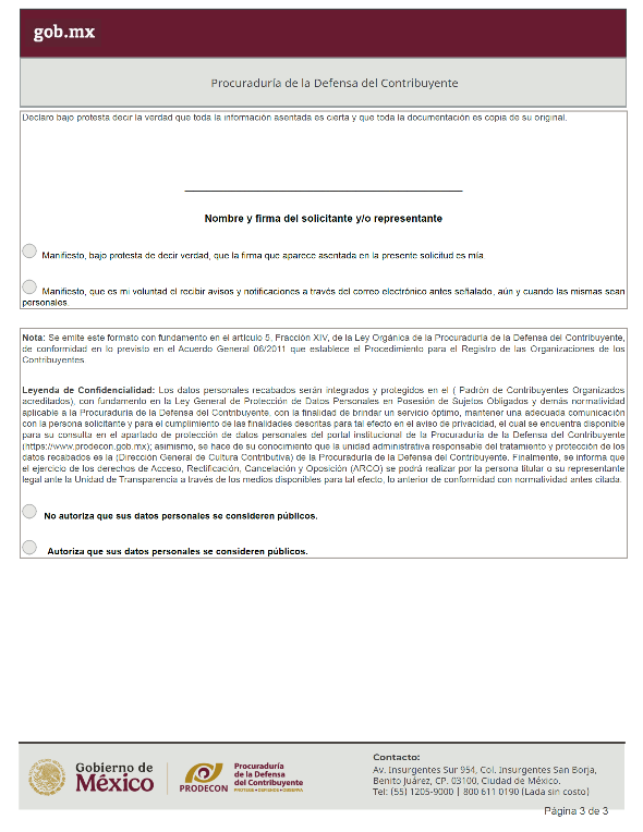 | 6 | PRODECON-2025-006 | Solicitud de Registro de Contribuyentes Organizados. | 1. Formato de solicitud FF-PRODECON-2025-006 2. Acta constitutiva. 3.Copia del nombramiento como titular de la organización o documento con el que acredite tal carácter. 4. Identificación oficial vigente. |