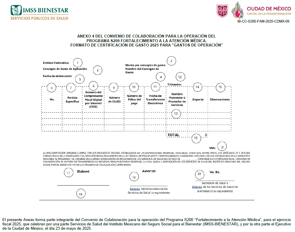 Firmas de los anexos 1, 1A, 2, 3, 3A, 4, 5, 6, 7, 8, 9, 10,11 y 12 del Convenio de Colaboración para la operación del Programa S200 "Fortalecimiento a la Atención Médica", para el ejercicio fiscal 2025, que celebran por una parte Servicios de Salud del Instituto Mexicano del Seguro Social para el Bienestar (IMSS-BIENESTAR), y por la otra parte el Ejecutivo de la Ciudad de México, el día 23 de mayo de 2025.