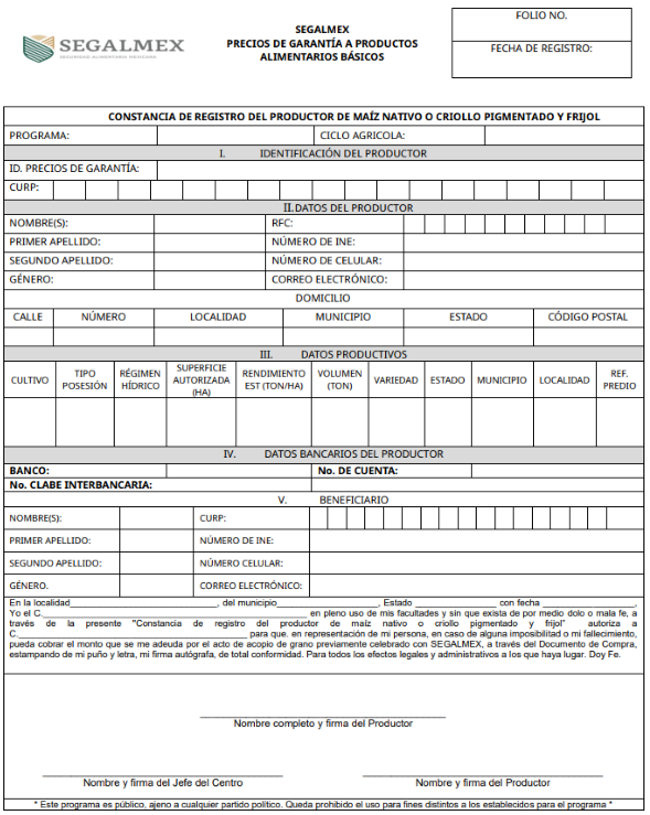 ANEXO 6. CONSTANCIA DE REGISTRO DEL PRODUCTOR DE MAÍZ, MAÍZ NATIVO O CRIOLLO PIGMENTADO Y FRIJOL