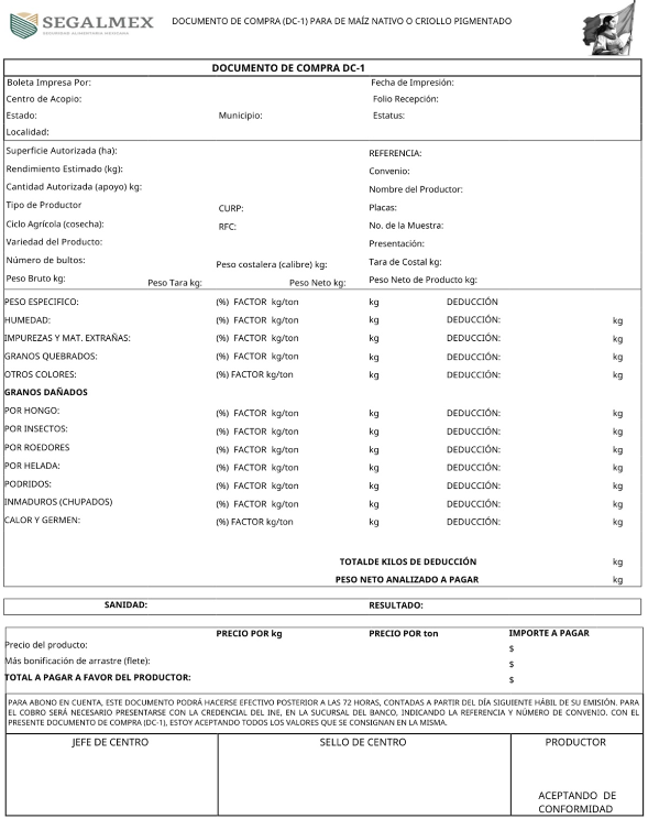 Los productores que vendan su cosecha de maíz, maíz nativo o criollo pigmentado o frijol a precio de garantía y que, por algún motivo justificable, no reciban de manera exitosa su pago a través del Documento de Compra (DC-1), que funge como la orden de pago, la Unidad Responsable implementará el procedimiento de pago establecido en la mecánica operativa.