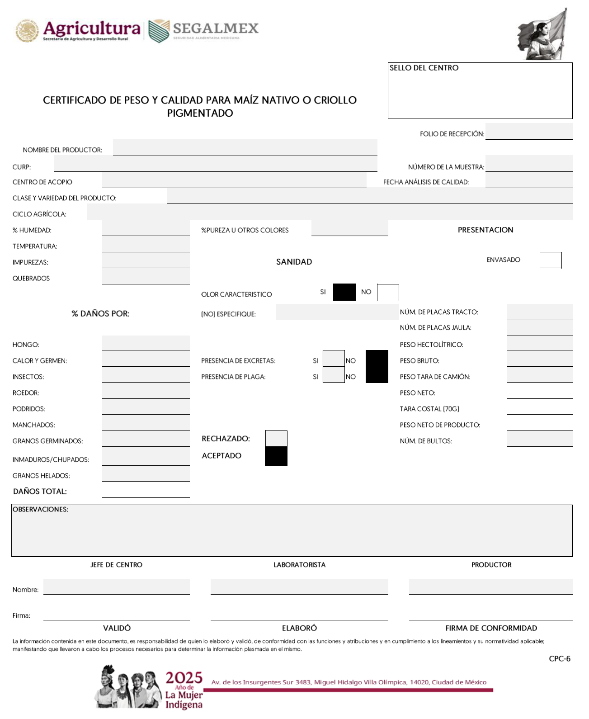 ANEXO 5.1 CERTIFICADO DE PESO Y CALIDAD DE MAÍZ NATIVO O CRIOLLO PIGMENTADO (CPC-6)