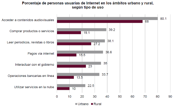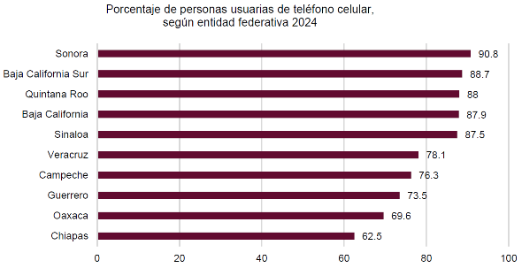 El Internet se usó con más frecuencia para comunicarse (93 %), para acceder a redes sociales (90.4 %), para entretenimiento (89 %), buscar información (88.2 %) y como apoyo a la capacitación o educación (81.3 %). Las entidades federativas con los mayores porcentajes de personas usuarias de Internet en 2024 fueron: Sonora (91.3%), Quintana Roo (90.7%), Baja California Sur (90.4%) y Coahuila (88.2%). En contraste, los menores porcentajes de usuarios de Internet se encuentran en los estados de Oaxaca (69.2 %) y Chiapas (64.9 %).