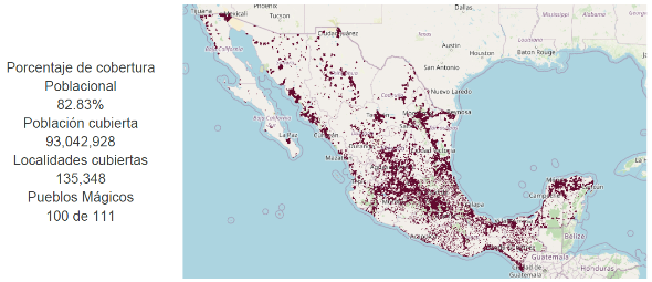 | Definición o descripción | Mide el porcentaje de población en localidades del territorio mexicano con menos de 10,000 habitantes que cuenta con cobertura de Banda Ancha Móvil de la Red Compartida respecto de la población total medida al inicio del contrato de Altán Redes en 2010. |