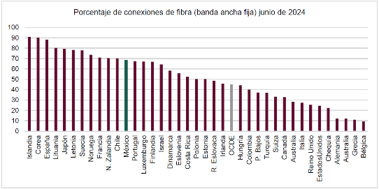 Conforme al estudio de banda ancha realizado por la OCDE, el porcentaje de conexiones de fibra para junio de 2024 por país, donde México se ha posicionado por arriba de Colombia 40% y Canadá 32.7% en cuanto a este rubro tal y como se muestra en la Gráfica 7:(15) /