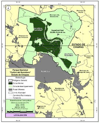 Superficie: 25,099-70-34.48 hectáreas (veinticinco mil noventa y nueve hectáreas, setenta áreas, treinta y cuatro punto cuarenta y ocho centiáreas). Ubicación: Municipios de Chiapa de Corzo, Osumacinta, San Fernando, Soyaló y Tuxtla Gutiérrez, en el estado de Chiapas.