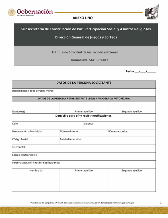 | 1 | SGOB-01-017 | Solicitud de inspección adicional | 1.Escrito libre de solicitud 2. Poder notarial | 1. Formato SGOB-01-017 2. Comprobante de Pago del trámite 3. Identificación oficial (INE o pasaporte vigente) de la persona solicitante |
