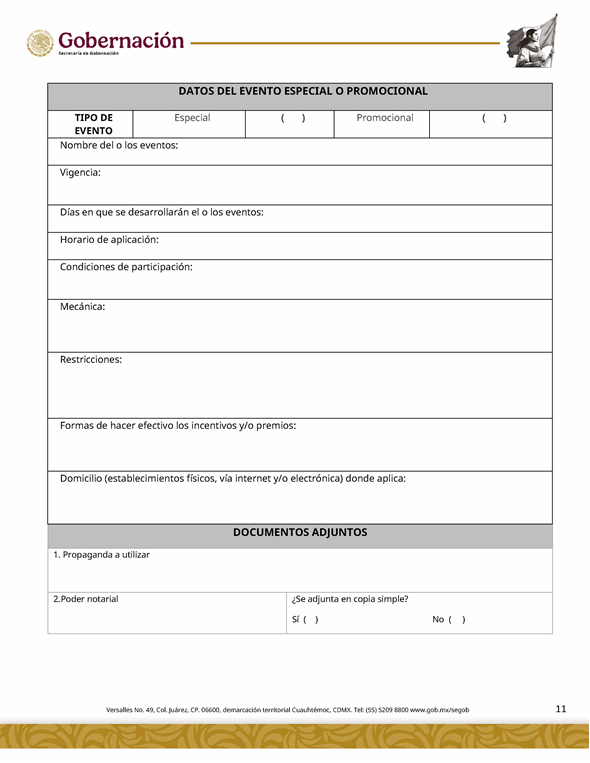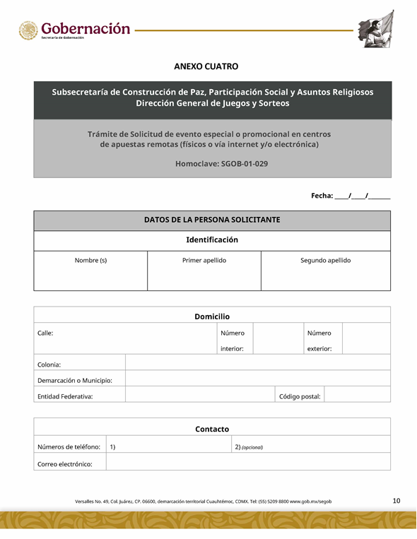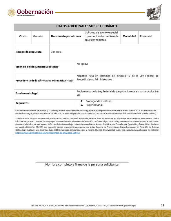 | 4 | SGOB-01-029 | Solicitud de evento especial o promocional en centros de apuestas remotas (físicos o vía internet y/o electrónica) | 1. Escrito libre firmado por interesado o su representante legal. 2. Escrito libre de solicitud | 1. Formato SGOB-01-029 2. Propaganda a utilizar 3. Poder notarial |