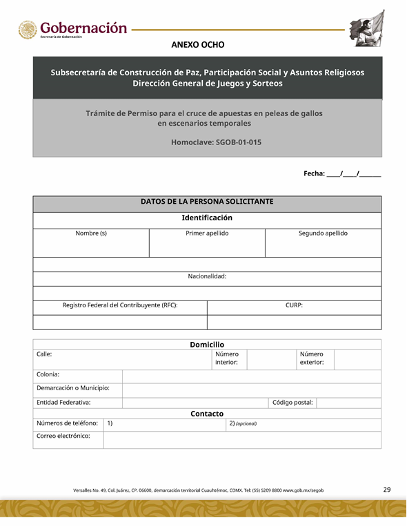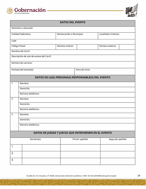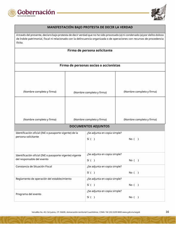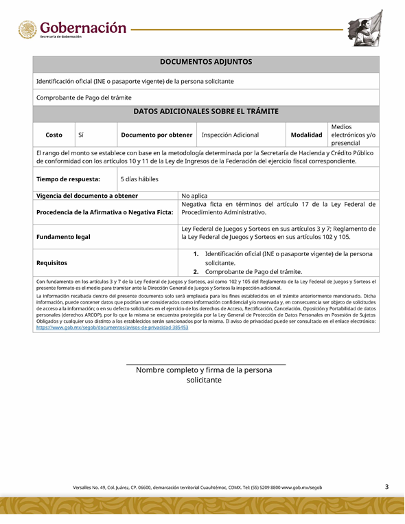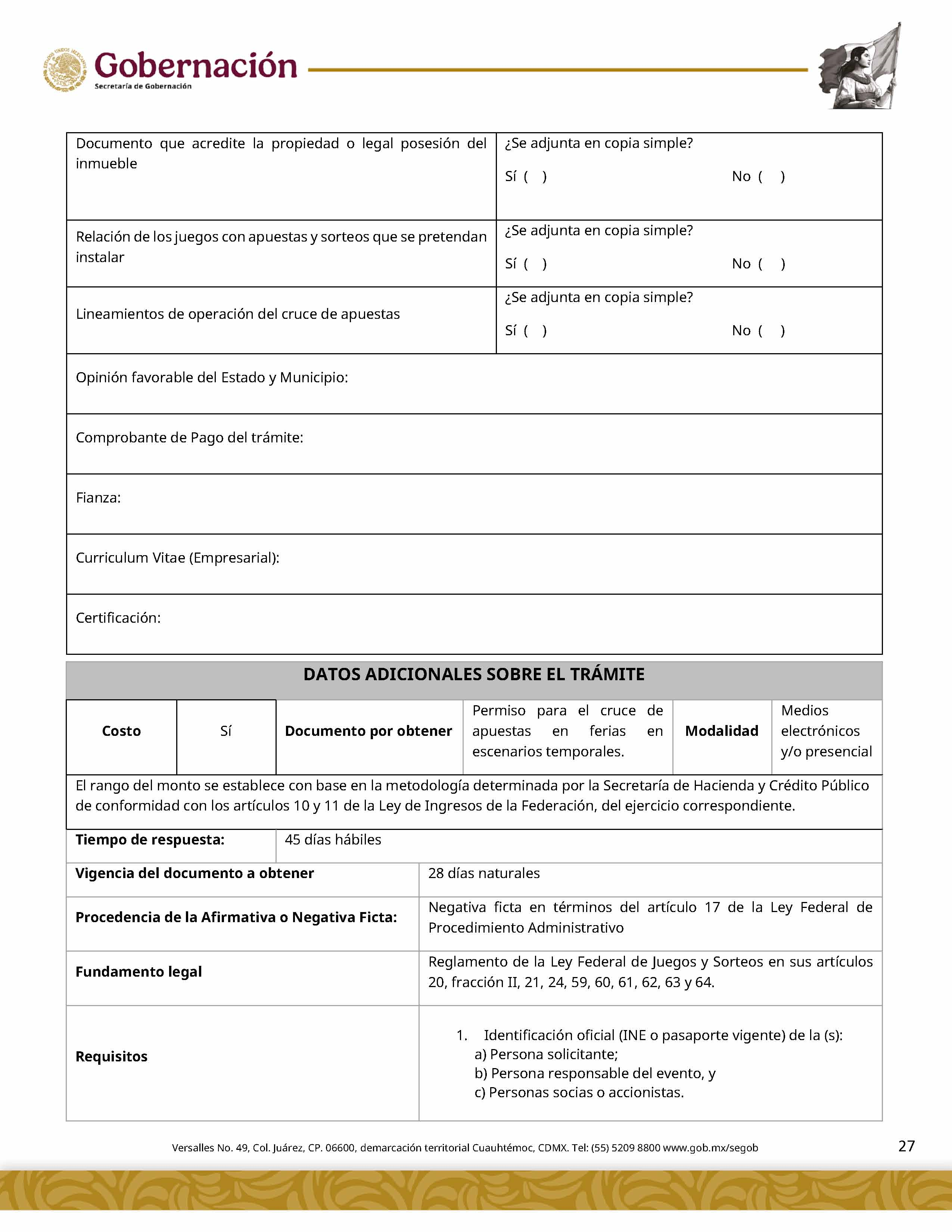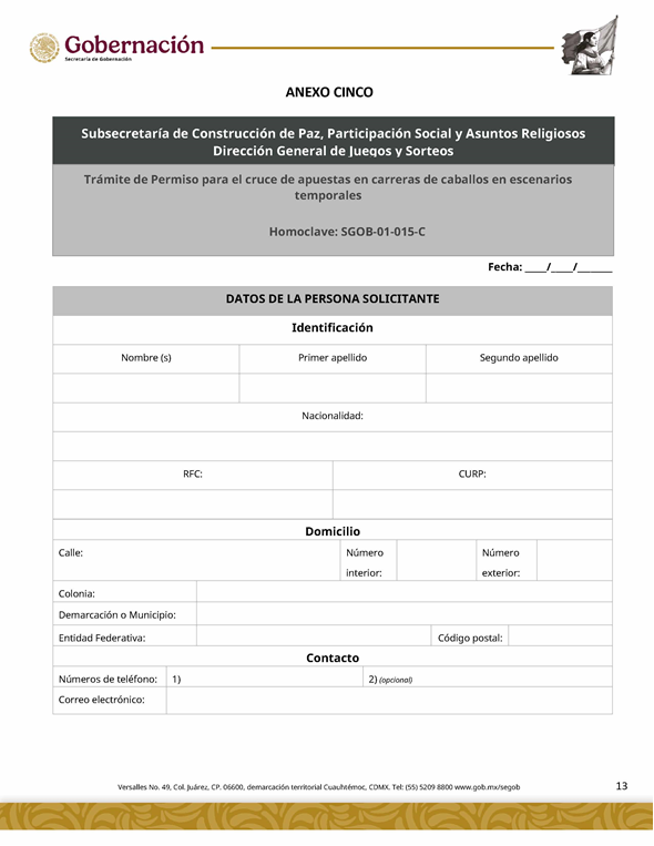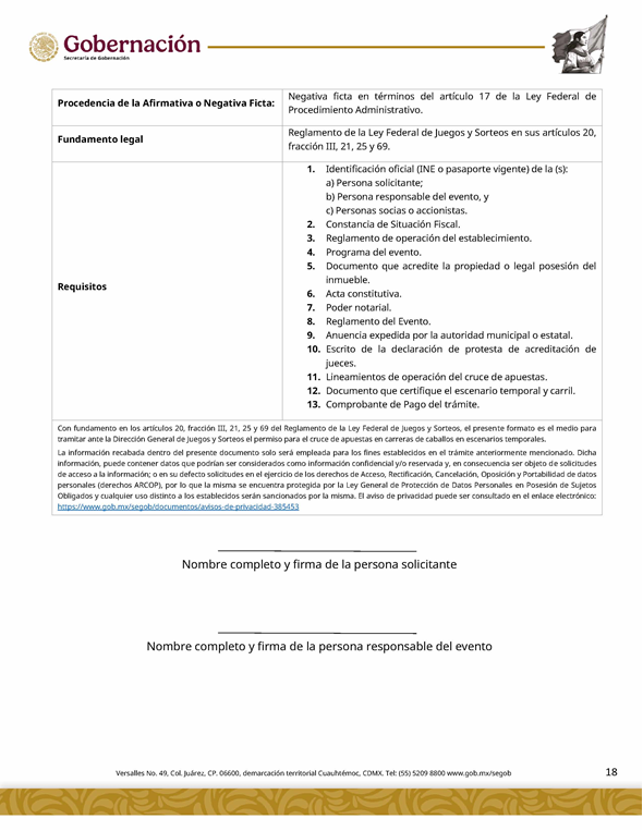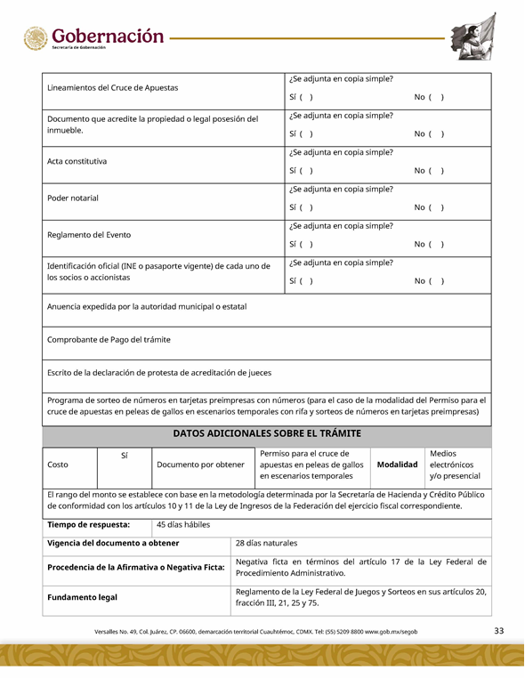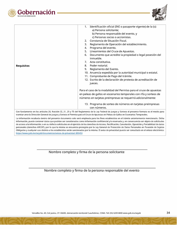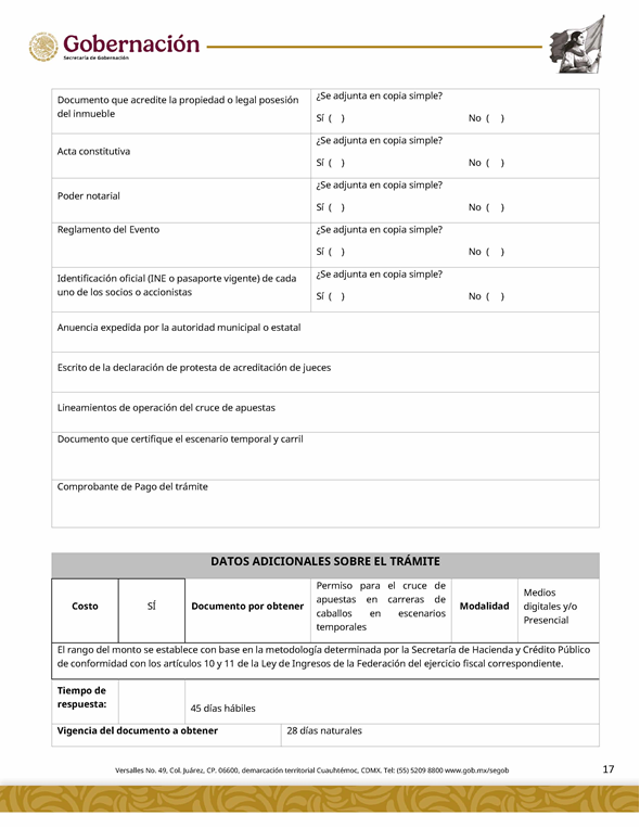 | 5 | SGOB-01-015-C | Permiso para el cruce de apuestas en carreras de caballos en escenarios temporales | 1. Escrito libre de solicitud. 2. Cédula Profesional. 3. Presentación física de la Clave Única de Registro de Población (CURP). 4. Manifestación bajo protesta de decir la verdad. 5. Bajo protesta e identificación oficial vigente (credencial para votar, pasaporte o cédula profesional). 6.Escrito libre del responsable del evento, así mismo, copia de la identificación oficial (credencial para votar y pasaporte vigente, así como cédula profesional). 7. Documentación de los socios o accionistas. | 1. Formato SGOB-01-015-C 2. Identificación oficial (INE o pasaporte vigente) de la (s): a) Persona solicitante; b) Persona responsable del evento, y c) Personas socias o accionistas. 3. Constancia de Situación Fiscal 4. Reglamento de operación del establecimiento 5. Programa del evento 6. Documento que acredite la propiedad o legal posesión del inmueble 7. Acta constitutiva 8. Poder notarial 9. Reglamento del Evento 10. Anuencia expedida por la autoridad municipal o estatal 11. Escrito de la declaración de protesta de acreditación de jueces 12. Lineamientos de operación del cruce de apuestas 13. Documento que certifique el escenario temporal y carril 14. Comprobante de Pago del trámite |