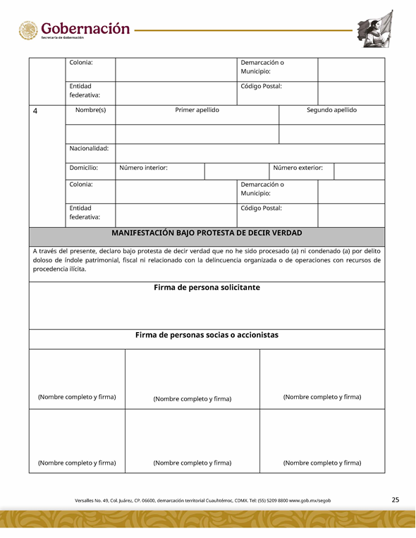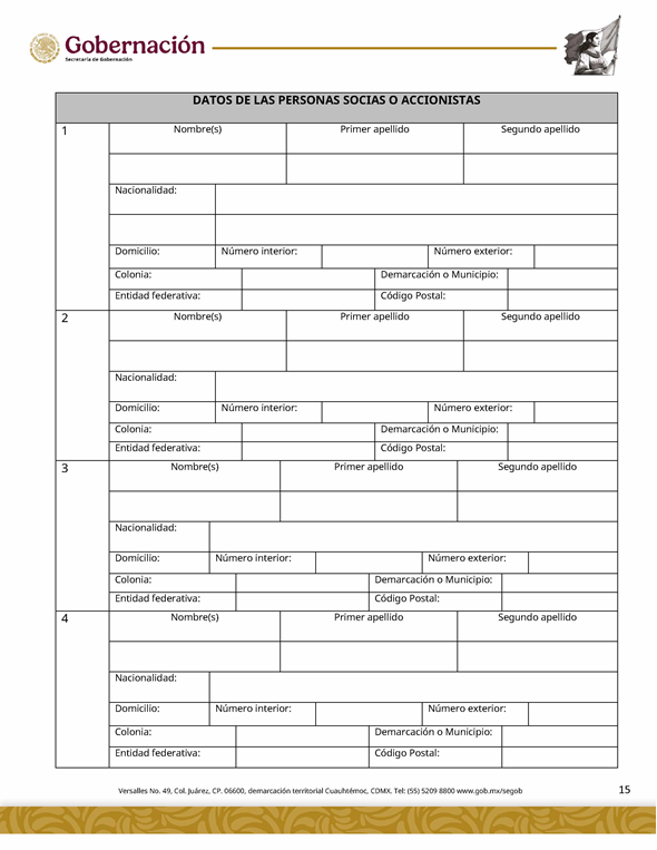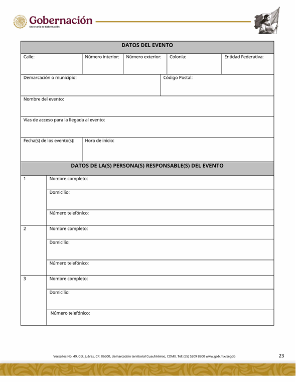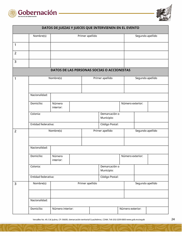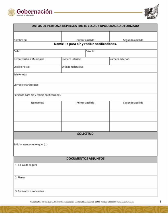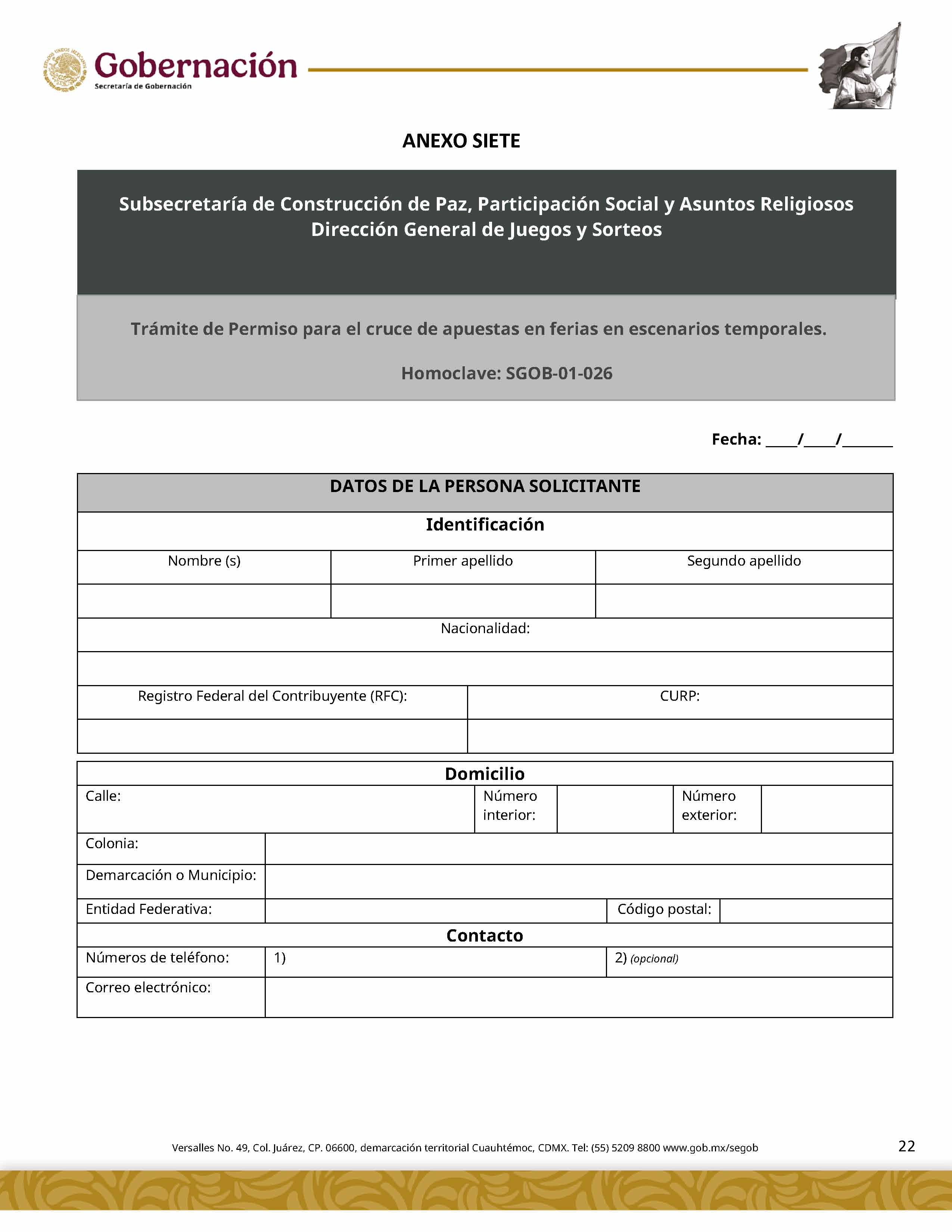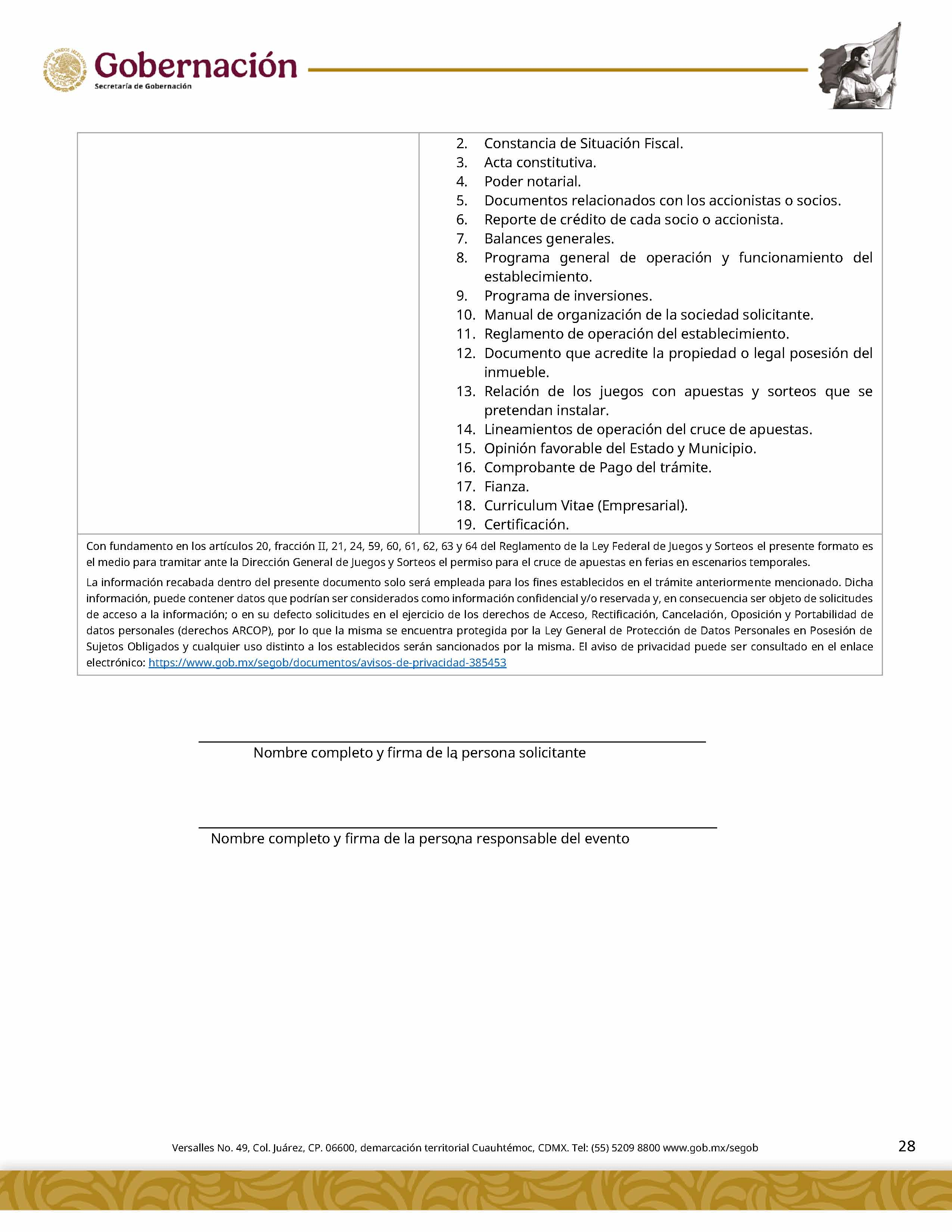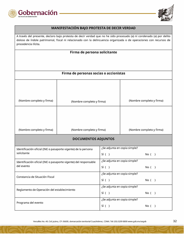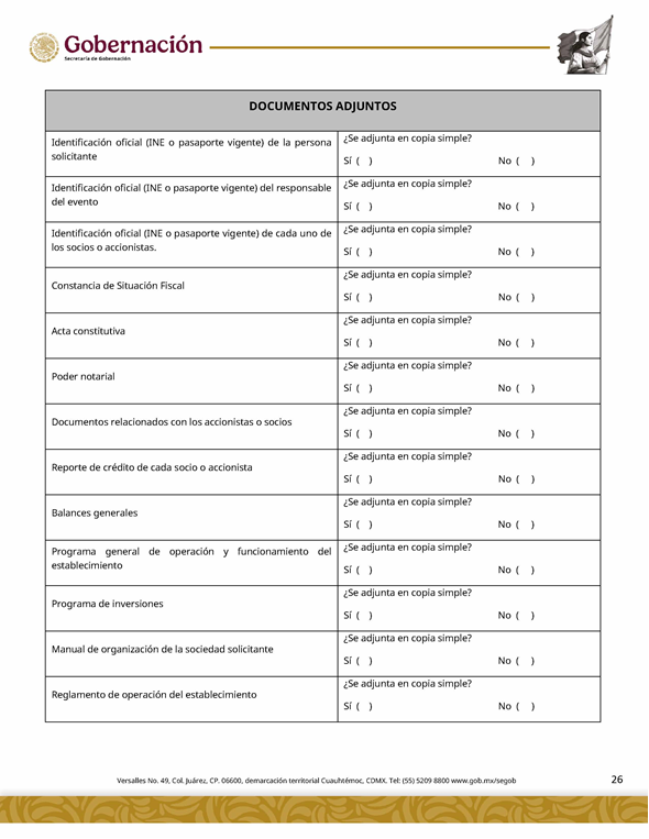 | 5 | SGOB-01-015-C | Permiso para el cruce de apuestas en carreras de caballos en escenarios temporales | 1. Escrito libre de solicitud. 2. Cédula Profesional. 3. Presentación física de la Clave Única de Registro de Población (CURP). 4. Manifestación bajo protesta de decir la verdad. 5. Bajo protesta e identificación oficial vigente (credencial para votar, pasaporte o cédula profesional). 6.Escrito libre del responsable del evento, así mismo, copia de la identificación oficial (credencial para votar y pasaporte vigente, así como cédula profesional). 7. Documentación de los socios o accionistas. | 1. Formato SGOB-01-015-C 2. Identificación oficial (INE o pasaporte vigente) de la (s): a) Persona solicitante; b) Persona responsable del evento, y c) Personas socias o accionistas. 3. Constancia de Situación Fiscal 4. Reglamento de operación del establecimiento 5. Programa del evento 6. Documento que acredite la propiedad o legal posesión del inmueble 7. Acta constitutiva 8. Poder notarial 9. Reglamento del Evento 10. Anuencia expedida por la autoridad municipal o estatal 11. Escrito de la declaración de protesta de acreditación de jueces 12. Lineamientos de operación del cruce de apuestas 13. Documento que certifique el escenario temporal y carril 14. Comprobante de Pago del trámite |
