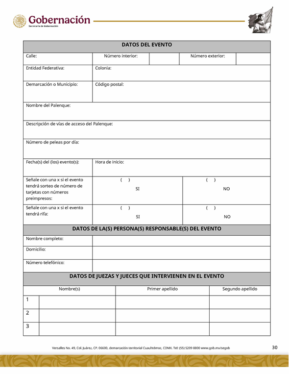 | 13. Escrito de la declaración de protesta de acreditación de jueces Para el caso de la modalidad del Permiso para el cruce de apuestas en peleas de gallos en escenarios temporales con rifa y sorteos de números en tarjetas preimpresas se requerirá adicionalmente: 14. Programa de sorteo de números en tarjetas preimpresas con números Tiempo de respuesta: 45 días hábiles |