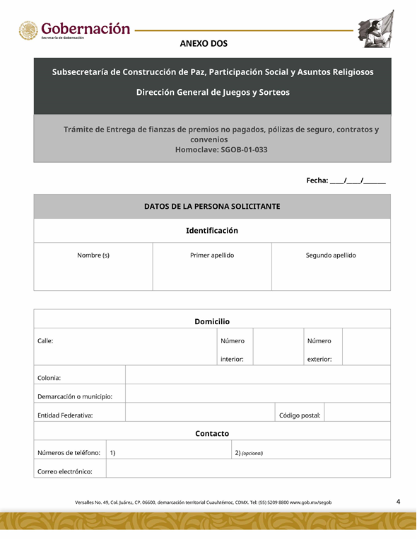 | 2 | SGOB-01-033 | Entrega de fianzas de premios no pagados, pólizas de seguro, contratos y convenios | 1.Escrito Libre de solicitud | 1. Formato SGOB-01-033 2. Póliza de seguro 3. Fianza 4. Contratos o convenios |