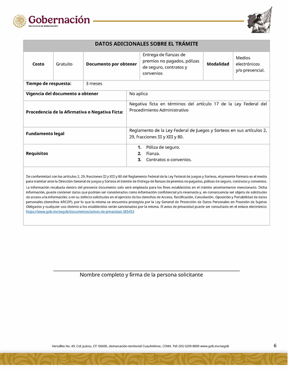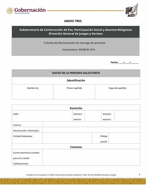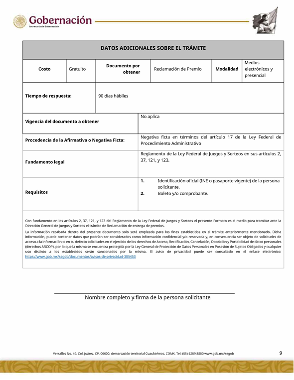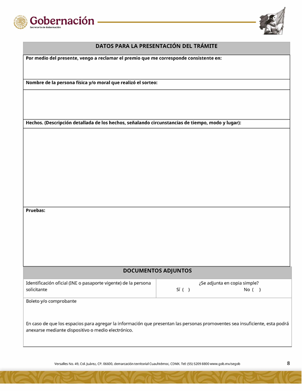 | 3 | SGOB-01-019 | Reclamación de entrega de premios | 1. Escrito Libre de solicitud | 1. Formato SGOB-01-019 2. Identificación oficial (INE o pasaporte vigente) de la persona solicitante 3. Boleto y/o comprobante |