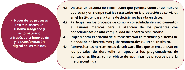 | 4. Hacer de los procesos Institucionales un sistema integrado y automatizado a través de la innovación y la transformación digital de los mismos. |