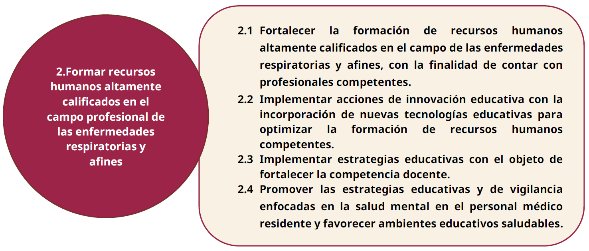 En alineación al mismo Eje General del PND y Objetivo 2 del PSS Incrementar la capacidad resolutiva y calidad de la atención médica del Sistema Nacional de Salud para la población usuaria, el segundo objetivo institucional corresponde en Formar recursos humanos altamente calificados en el campo profesional de las enfermedades respiratorias y afines.