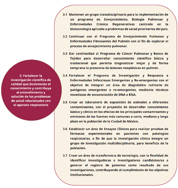 | 3. Fortalecer la investigación científica de calidad que incremente el conocimiento y contribuya al entendimiento y solución de los problemas de salud relacionados con el aparato respiratorio. |