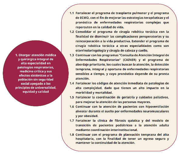 | 1. Otorgar atención médica y quirúrgica integral de alta especialidad en patologías respiratorias, medicina crítica y sus efectos sistémicos a la población sin seguridad social apegado a los principios de universalidad, equidad y calidad. |