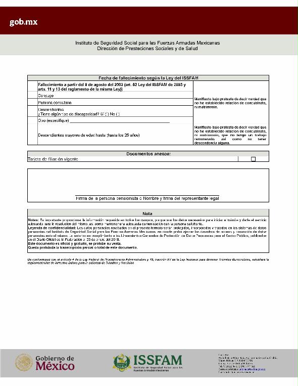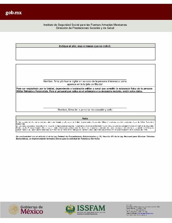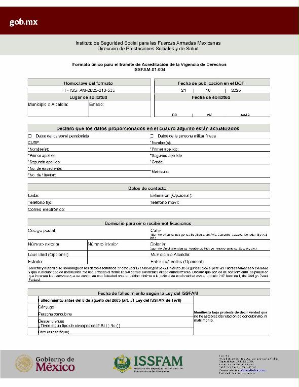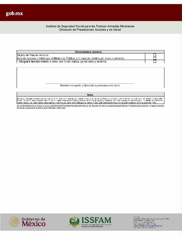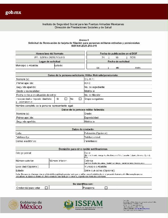 | 2 | ISSFAM-2025- 213-019 | Renovación de la tarjeta de filiación para militares retirados y pensionistas. | 1. Fotografía reciente tamaño infantil a color, con fondo blanco y papel mate; aplicable únicamente en aquellos trámites que se realicen de manera presencial, en virtud de que el I.S.S.F.A.M. cuenta con un Módulo para su captura. | 1. Formato o formulario de solicitud requisitado. 2. Tarjeta de filiación vencida o acta de extravío emitida por el Ministerio Público. |