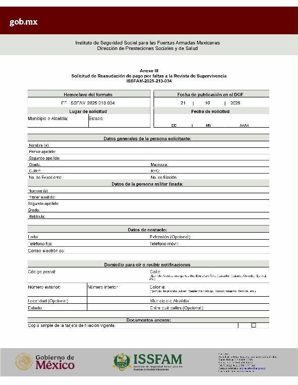 ARTÍCULO SEXTO. Se establece el Formato de solicitud para el trámite de "Solicitud de reanudación de pago por falta a la Revista de Supervivencia ante el ISSFAM", mismo que se integra como ANEXO TRES.