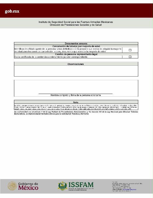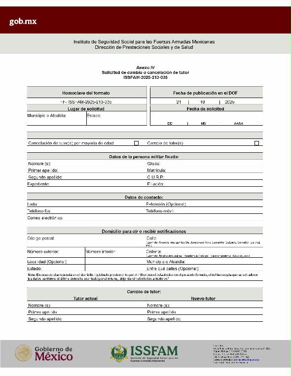 | 3 | ISSFAM-2025- 213-035 | Solicitud de cambio o cancelación de tutor. | 1. Formato de cancelación o cambio de representante legal F21DPSS debidamente requisitado y con firma autógrafa de la persona interesada. 2. Copia de la última tarjeta de filiación. 3. Copia de la identificación oficial vigente de la o el interesado (Credencial para votar, Cédula profesional o Pasaporte) en caso de no contar con dicho documento deberá presentar copia simple del acta de nacimiento o C.U.R.P., lo anterior con la finalidad de acreditar la mayoría de edad. 4. Copia de la sentencia u ordenamiento judicial mediante el cual se realizó la designación de tutor. | 1. Formato de solicitud requisitado. 2. Identificación oficial vigente de la persona solicitante. En caso de cancelación, por haber adquirido la mayoría de edad: 3. Documento con el que acredite la mayoría de edad. En caso de cambio de tutor, además deberá presentar: 4. Copia certificada de la sentencia u ordenamiento judicial correspondiente. |