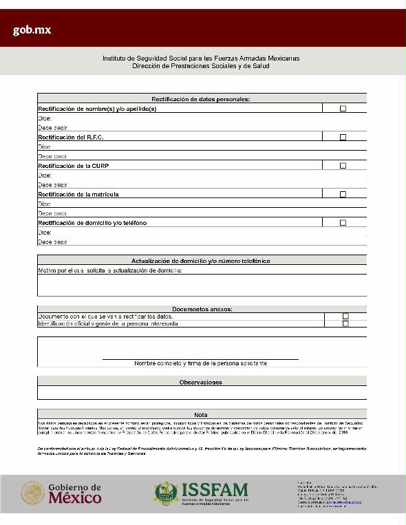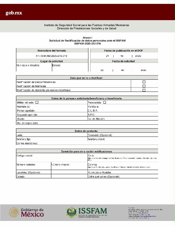 | 1 | ISSFAM-2025- 213-016 | Solicitud de rectificación de datos personales ante el ISSFAM. | 1. Acta de nacimiento actualizada, con vigencia no mayor de 1 año. 2. Presentación física de la Clave Única de Registro de la Población (C.U.R.P.). 3. Tarjeta de filiación vigente. | 1.Formato o formulario de rectificación de datos personales, requisitado. 2. Identificación oficial vigente de la persona interesada. 3. Documento con el que se van a rectificar los datos. |
