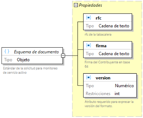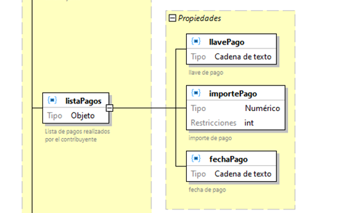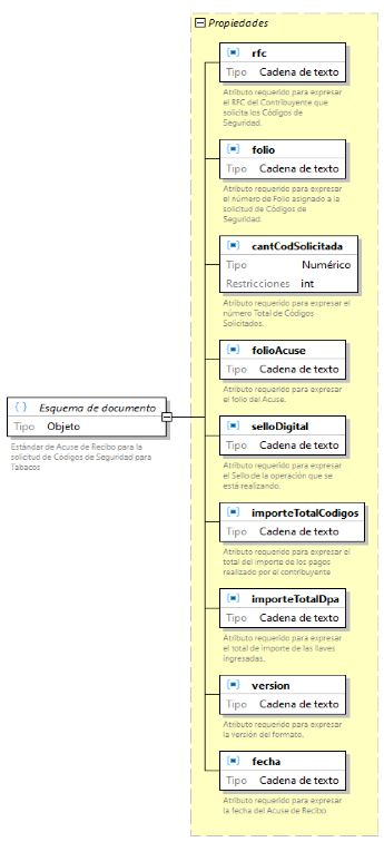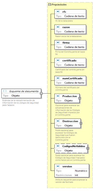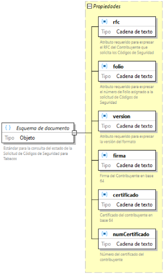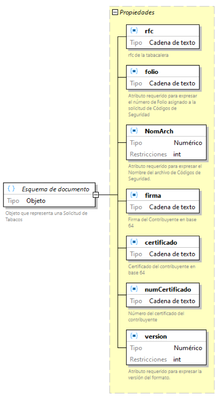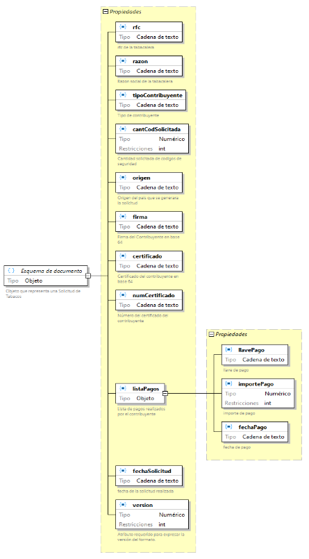 | | Código Fuente { "$schema": "http://json-schema.org/schema#", "description": "Objeto que representa una Solicitud de Tabacos", "type": "object", "properties": { "rfc": { "description": "rfc de la tabacalera", "type": "string" }, "razon": { "description": "Razon social de la tabacalera", "type": "string" }, "tipoContribuyente": { "description": "Tipo de contribuyente", "type": "string" }, "cantCodSolicitada": { "description": "Cantidad solicitada de codigos de seguridad", "type": "integer" }, "origen": { "description": "Origen del pais que se generara la solicitud", "type": "string" }, "firma": { "description": "Firma del Contribuyente en base 64", "type": "string" }, "certificado": { "description": "Certificado del contribuyente en base 64", "type": "string" }, "numCertificado": { "description": "Número del certificado del contribuyente", "type": "string" }, "listaPagos": { "description": "Lista de pagos realizados por el contribuyente", "type": "object", "properties": { "llavePago": { "description": "llave de pago", "type": "string" }, "importePago": { "description": "importe de pago ", "type": "integer" }, "fechaPago": { "description": "fecha de pago ", "type": "string" } }, "required": [ "llavePago", "importePago", "fechaPago" ], "additionalProperties": false }, "fechaSolicitud": { "description": "fecha de la solicitud realizada", "type": "string" }, "version": { "description": "Atributo requerido para expresar la versión del formato.", "type": "integer" } }, "required": [ "rfc", "razon", "tipoContribuyente", "cantCodSolicitada", "origen", "firma", "certificado", "numCertificado", "listaPagos", "fechaSolicitud", "version" ], "additionalProperties": false } |