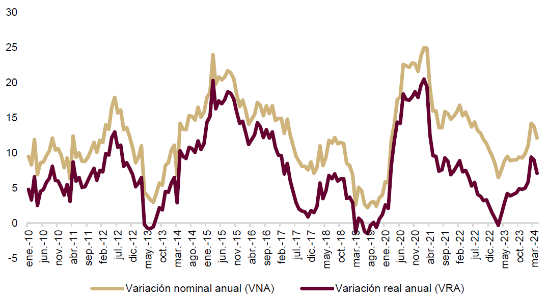 De acuerdo con datos del BM, después del alza significativa en la circulación de monedas y billetes en los años de pandemia, con un crecimiento de entre el 11.8% y 25%, y de un posterior periodo de crecimiento estable, con tasas de crecimiento que oscilaron entre el 6.5% y 9.9%, en el primer trimestre de 2024 se registró un aumento en la circulación de monedas y billetes, derivado de la dispersión de recursos de los programas sociales, a su vez consecuencia de la veda electoral(3). En este sentido, el comportamiento estable de la circulación de monedas y billetes de los años más recientes puede responder a los efectos de la política monetaria actual, así como la actividad económica del país.