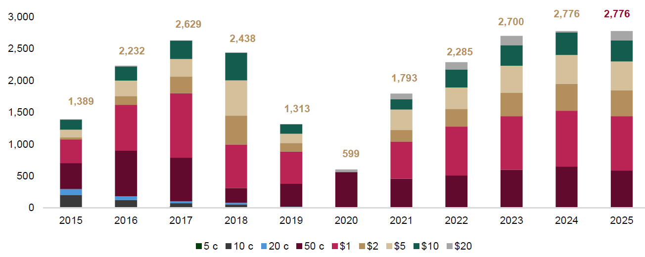 34 Banco de México (2025). Acuñación de Moneda - Ordenada. Sistema de Información Económica. Banco de México. Disponible en: https://www.banxico.org.mx/SieInternet/consultarDirectorioInternetAction.do?§or=11&accion=consultarDirectorioCuadros&locale=es