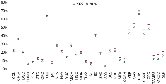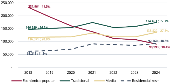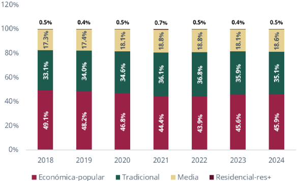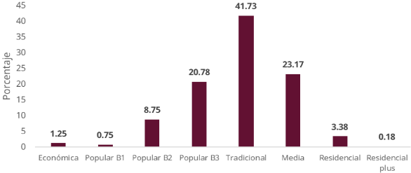 10 Cálculo realizado con base en las condiciones medias de mercado de 2024: Tasa de interés promedio de 11.5%, un enganche de 10% del valor de avalúo de la vivienda, un plazo de 20 años y una carga hipotecaria del 20%. Se utilizó el valor mínimo de una vivienda de clase tradicional, el cual corresponde a 200 UMAS, que para 2024 equivalían a 660,106 pesos.