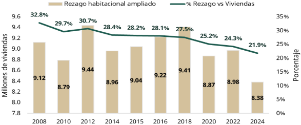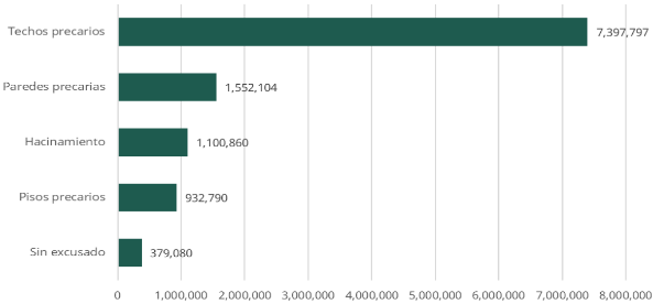 7 Una vivienda se encuentra en rezago cuando cuenta con materiales precarios en techos, paredes o pisos, hacinamiento (más de 2.5 personas por cuarto) o no cuenta con escusado.