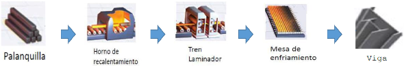 b. Posteriormente, las palanquillas son laminadas en un tren de laminación, en el cual se deforma el acero hasta lograr la forma geométrica y las dimensiones deseadas.