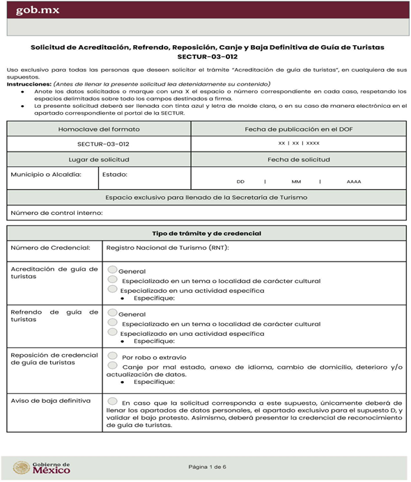 Artículo 4. A través del portal de la Secretaría de Turismo, se actualiza el Formato de Solicitud de Acreditación, Refrendo, Reposición, Canje y Baja Definitiva de Guía de Turistas. Se adjunta al presente Acuerdo como ANEXO I.