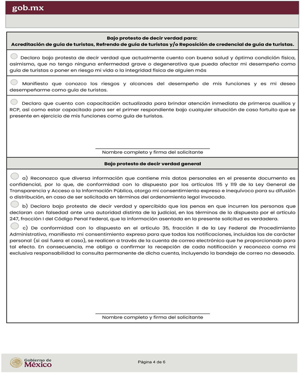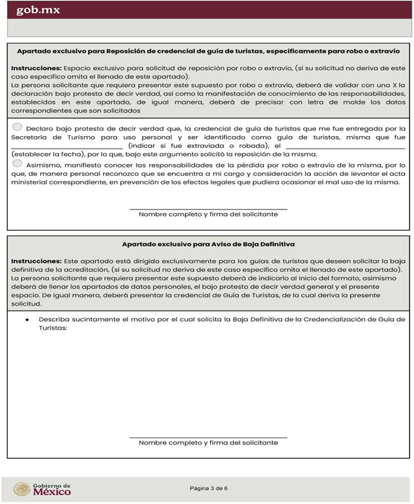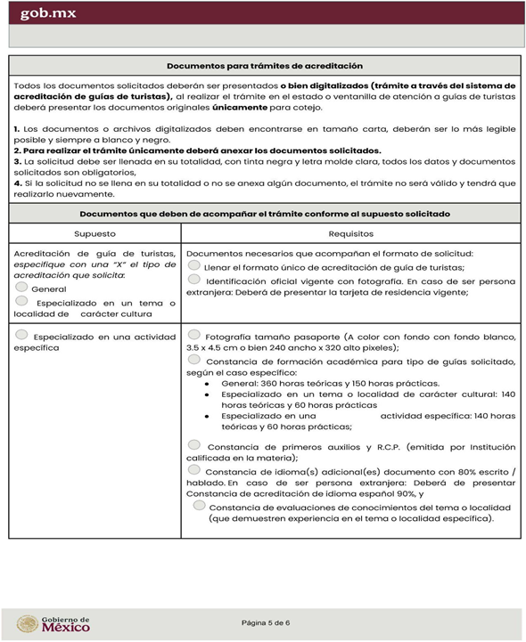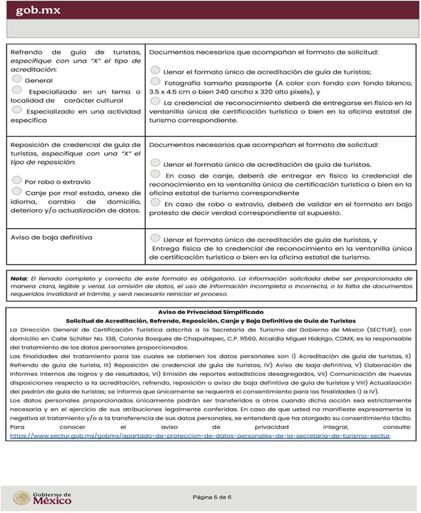 | 7 | Reposición | 1. Presentación física de la Clave Única del Registro de Población (CURP). Bastará con proporcionar la clave alfanumérica en el formato único de acreditación de guía de turistas. 2. Fotografía tamaño pasaporte (A color con fondo blanco, 3.5 x 4.5 cm o bien 240 ancho x 320 alto pixeles). 3. Para reposición por robo o extravío, se elimina la obligación de presentar acta ministerial de robo/ extravío. Bastará con precisar en el formato en el bajo protesto de decir verdad correspondiente a robo o extravío. |