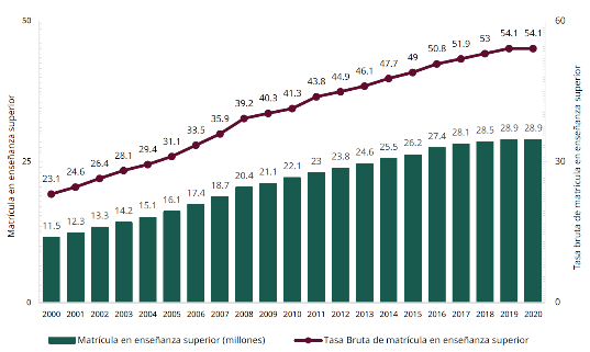 De acuerdo con estimaciones de la Organización de las Naciones Unidas para la Educación, la Ciencia y la Cultura (UNESCO), la tasa bruta de asistencia a la educación superior en América Latina es de 65.5% y en México con base en la Encuesta Nacional de Ingresos y Gastos de los Hogares (ENIGH) 2022 es de 58.5%; en tanto que la tasa neta es de 28.7% y 34.5% respectivamente. El porcentaje de personas en edad entre 18 y 24 años que no estudian ni están económicamente activos es de 15.8% para México casi un punto porcentual superior a la media en América Latina.