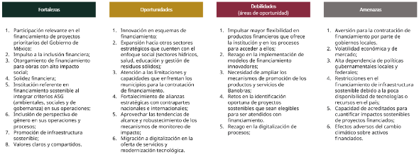 36 Temas materiales: 1) Ética Institucional, 2) Gobierno Institucional, 3) Financiamiento de proyectos sustentables, 4) Inclusión financiera de municipios, 5) Fondeo Sustentable, 6) Desarrollo y capacitación, 7) Cambio climático, 8) Gestión de Cartera sustentable, 9) Privacidad y Seguridad de los Datos, 10) Financiamiento de proyectos e infraestructura con perspectiva de género, 11) Derechos humanos y 12) Gestión de riesgos.