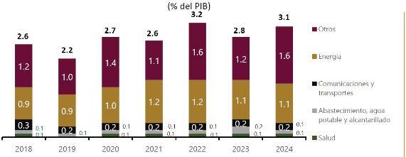 De acuerdo con el BID, de 2019 y hasta 2030, los países de ALC necesitan incrementar 70% la inversión, para pasar de 1.8% a 3.12% del PIB de la región para expandir y mantener la infraestructura necesaria para cumplir con los ODS: 59% deberá destinarse a inversiones para infraestructura nueva y 41% a inversiones de mantenimiento y reposición(9). En el caso de México, de acuerdo con la SHCP, la inversión pública en infraestructura física promedió 2.7% del PIB entre 2018 y 2024(10), lo que la coloca por debajo del umbral recomendado por el BID de 5% del PIB.