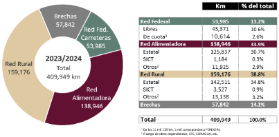 13 SICT (2024a). Anuario Estadístico del Sector Infraestructura, Comunicaciones y Transportes 2023: https://www.sct.gob.mx/fileadmin/DireccionesGrales/DGP/PDF/DEC-PDF/Anuario_SICT_2023.pdf, SICT (2024b). Sexto Informe de Labores 2023-2024: https://www.sct.gob.mx/fileadmin/DireccionesGrales/DGP/PDF/Documentos-2019-2024/6to_IL_SICT__2023-2024.pdf, y Programa Nacional de Infraestructura Carretera 2025.
