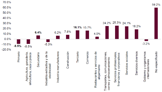 En este contexto, para el mismo periodo la ocupación y empleo presentó en la mayoría de las actividades una ganancia, el sector secundario con 6.4%, terciario de 16.1% y comercio por 15.7%, esto demuestra la recuperación del empleo a pesar de la desaceleración que se provocó a raíz de la pandemia generada por el virus SARS-CoV2 en 2020, no obstante se observan disminuciones en el sector primario del 8.5%, industria extractiva y de la electricidad 5.3%, así como el Gobierno y organismos internacionales de 3.2 por ciento.