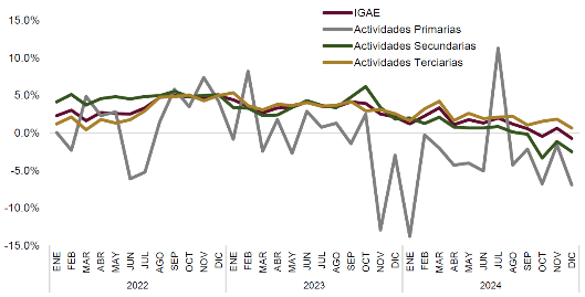 Asimismo, por lo que se refiere al Indicador Global de Actividad Económica (IGAE)(3), al cierre del ejercicio 2024, presentó una variación en tasa anual a la baja de 0.7 pasando de 104.7 a 103.9, considerando que tanto las actividades primarias disminuyeron, así como las secundarias, siendo 6.9% y 2.5% respectivamente, mientras que, las actividades terciarias aumentaron 0.7 por ciento.