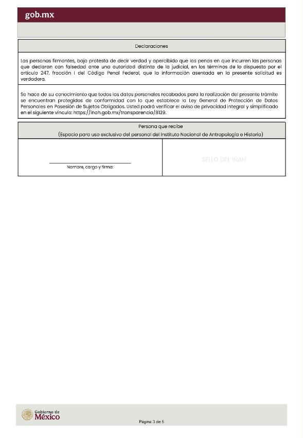 | 3 | INAH-03-002 | Solicitud de permiso para la transportación, cambio de domicilio y/o exhibición de monumentos arqueológicos muebles dentro del territorio nacional en custodia de particulares | 1. Formato INAH-03-002, "Solicitud de permiso para la transportación, cambio de domicilio y/o exhibición de monumentos arqueológicos muebles dentro del territorio nacional en custodia de particulares". | 10 días hábiles | 5 días hábiles |