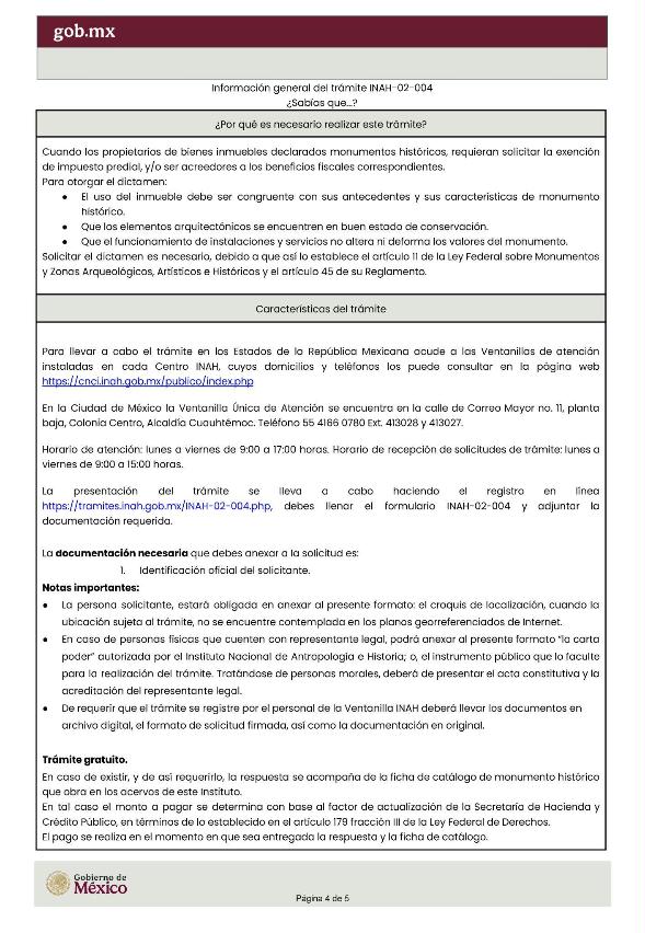 | 2 | INAH-02-004 | Solicitud de dictamen técnico para tramitar la exención de impuesto predial, sobre inmuebles que son monumentos históricos | 10 días hábiles | 8 días hábiles |