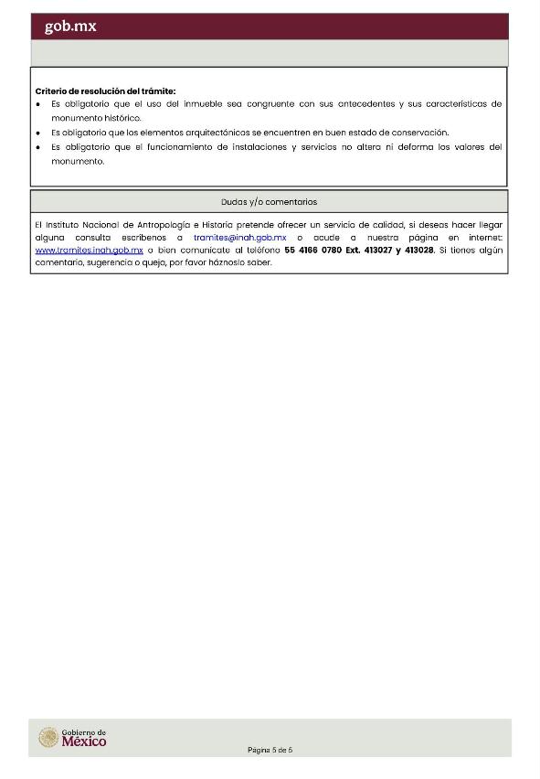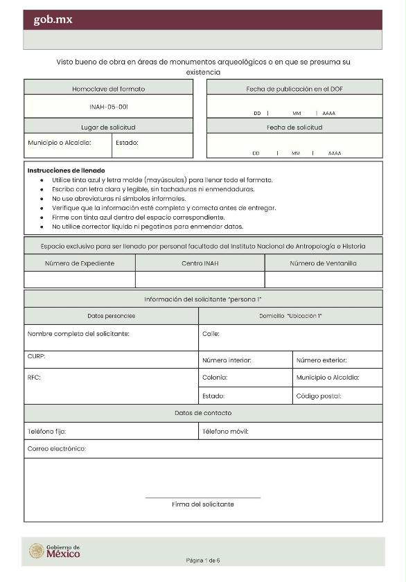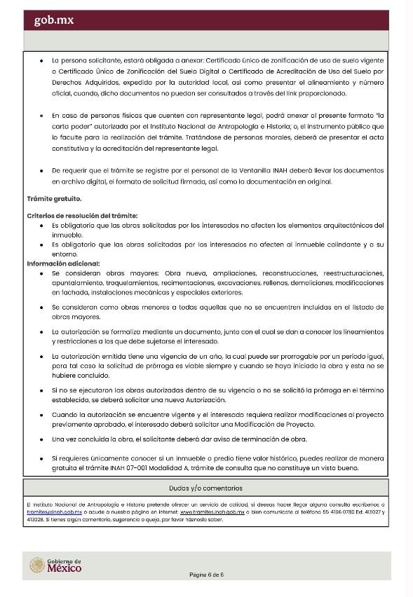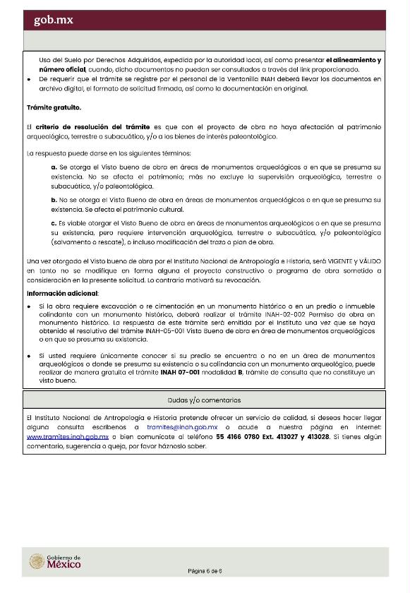 | 10 | INAH-05-001 | Visto bueno de obra en áreas de monumentos arqueológicos o en que se presuma su existencia | Visto bueno de obra en áreas de monumentos arqueológicos o en que se presuma su existencia | X |