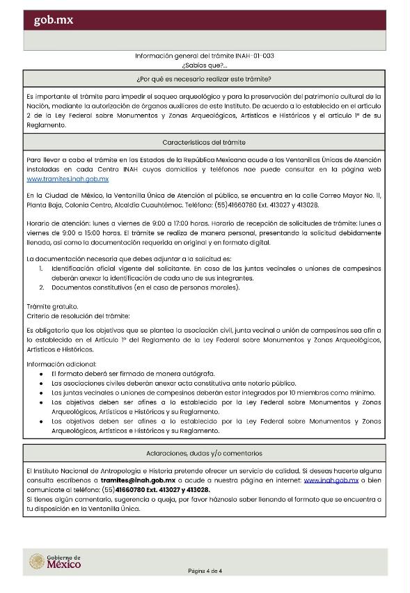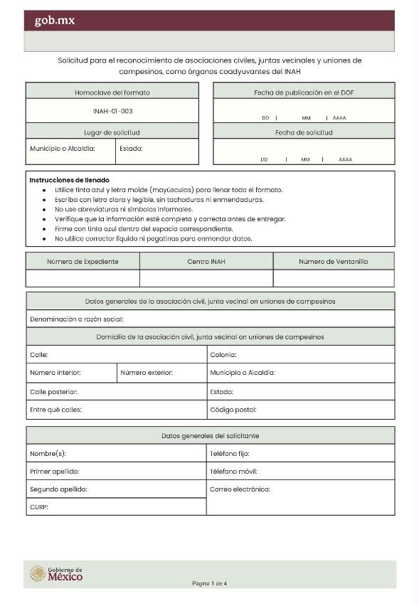 | 1 | INAH-01-003 | Solicitud para el reconocimiento de asociaciones civiles, juntas vecinales y uniones de campesinos, como órganos coadyuvantes del INAH. | 1. Formato INAH-01-003 "Solicitud para el reconocimiento de asociaciones civiles, juntas vecinales y uniones de campesinos, como órganos coadyuvantes del INAH". | 30 días hábiles | 15 días hábiles |