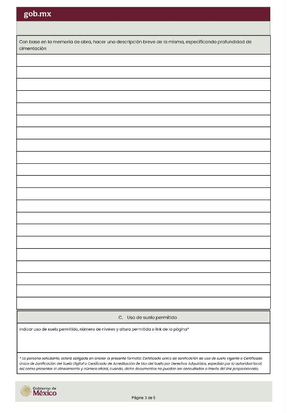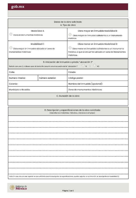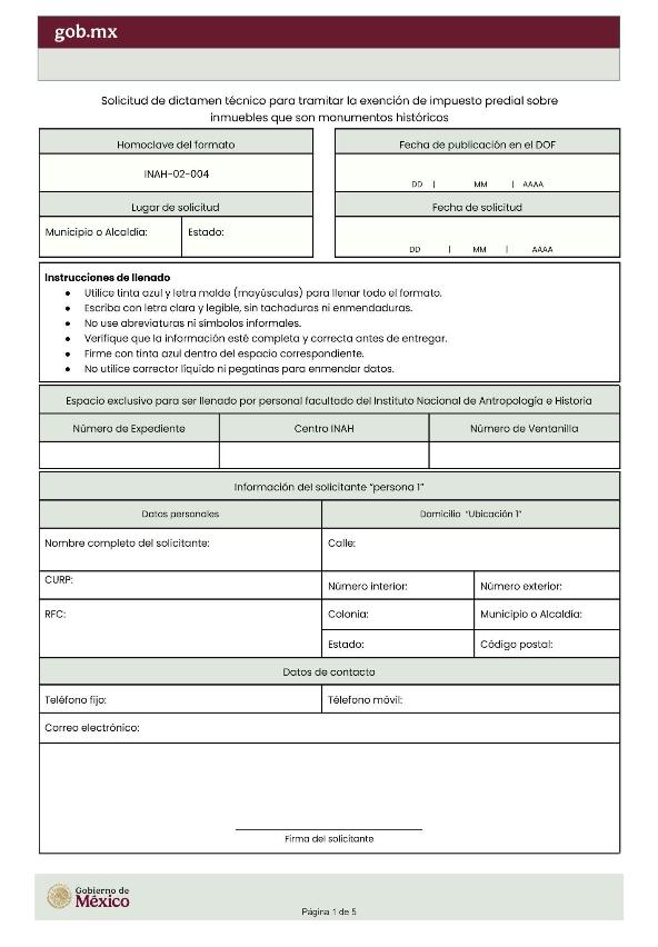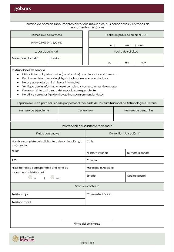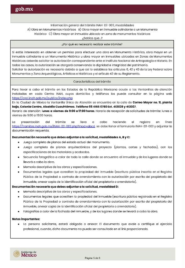 | 5 | INAH-03-001-C | Solicitud para la inscripción de Monumentos Arqueológicos, Históricos y de Comerciantes en Monumentos Históricos; en el Registro Público de Monumentos y Zonas Arqueológicos e Históricos. Modalidad: Inscripción de un monumento histórico inmueble, a petición de parte. | 1. Fotografías a color del inmueble interior y exterior. 2. Croquis de localización. |